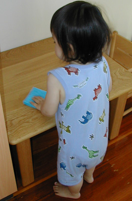 - If she stops watching, draw her attention back by showing her how dirty the cloth is after wiping the dusty surface.