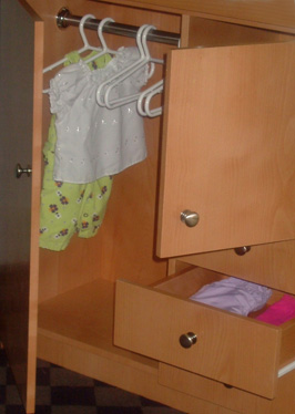 - Put clothes in drawers and cupboards at a level where your child can reach and take them out for herself. It is important to put just a few suitable clothes since children feel overwhelmed and cannot make choices for themselves if there are too many options. If you make sure that you only put out the ones you are happy for her to wear then it does not matter what she chooses. You don’t mind and she is happy because she feels she has a say in the matter!