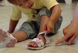 - ‘I am going to show you how to put a sock on.’ Sometimes she will want to watch, sometimes not. Respect her choice.