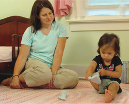- If you have captured her attention, it is her turn to imitate what she saw and to attempt to pull on her sock.