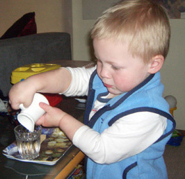- Once he can do this you can also show him how to pour his own drink from a small jug with a small amount of juice, water or milk in it.
