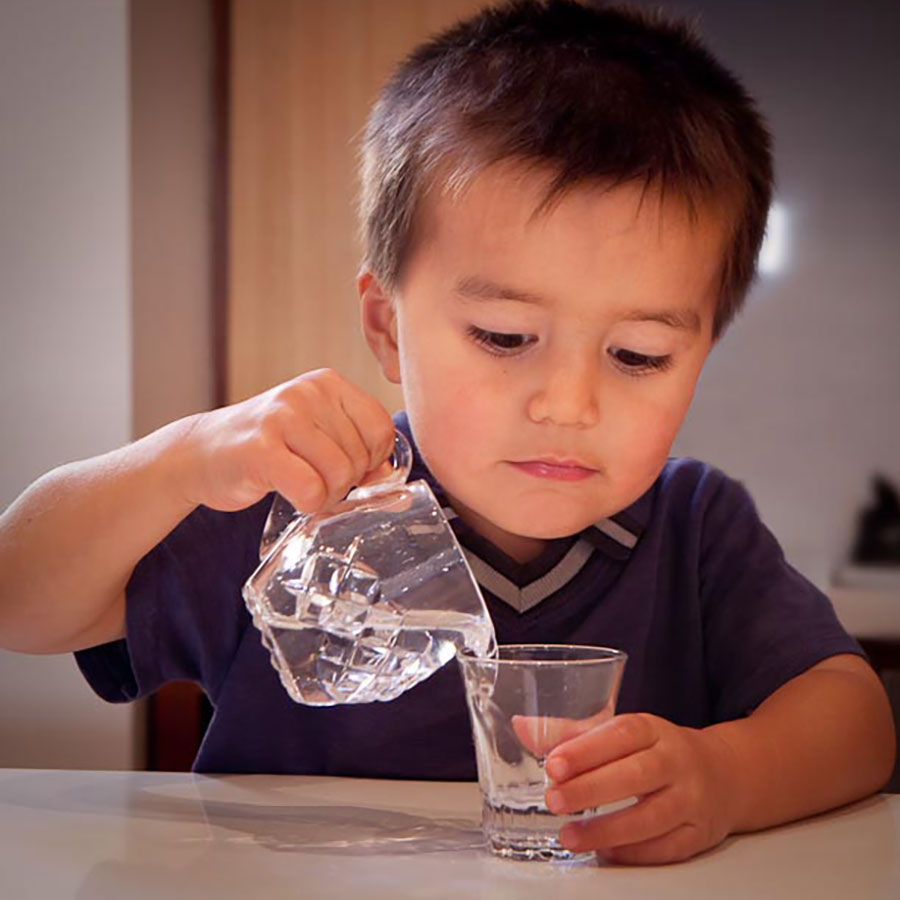 Empty a low kitchen cabinet for your child's small drinking glasses, a small jug (pitcher), bowls, plates, spoons, and forks, each with their own place or container in that cupboard.