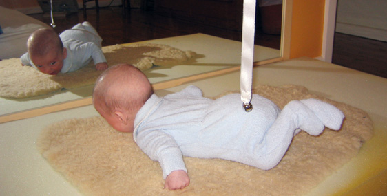 - Place a thin mat for movement on the floor in any place where your baby spends time. This mat should be neutral in colour rather than highly coloured and patterned. This allows your baby to see the things that you place on it more clearly.