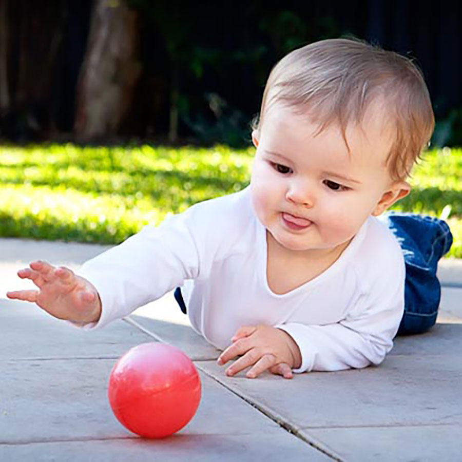 Provide reasons to move. Captivating objects just out of reach are an enticement to stretch, slither, creep, and crawl. Knit and cloth balls roll slowly, attract his grasping arms, and keep his attention. As he gains coordination offer faster-moving balls.